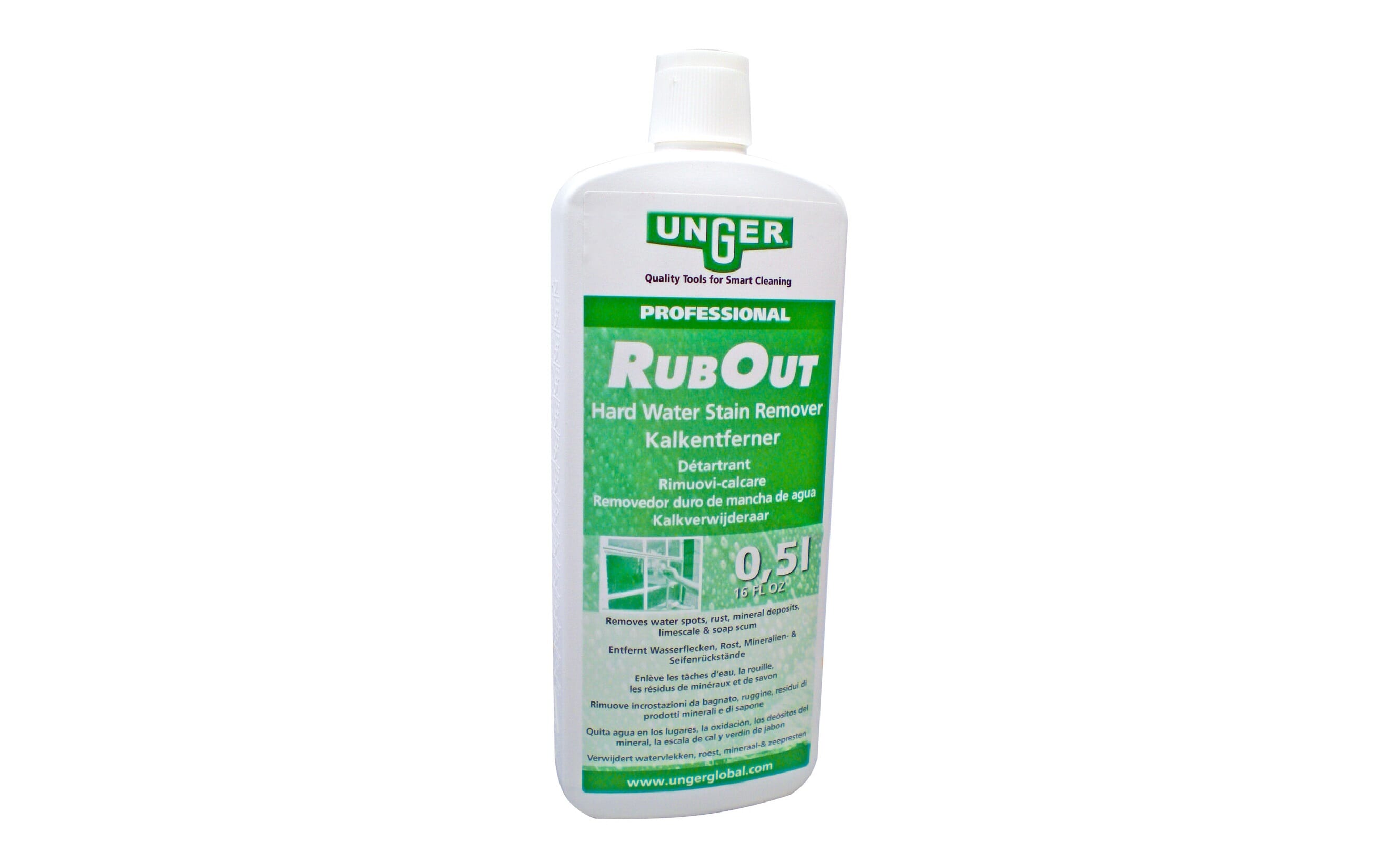 Unger Rub Out is a professional cleaner that effectively removes stains, limescale, minerals, and rust from smooth, water-resistant surfaces.